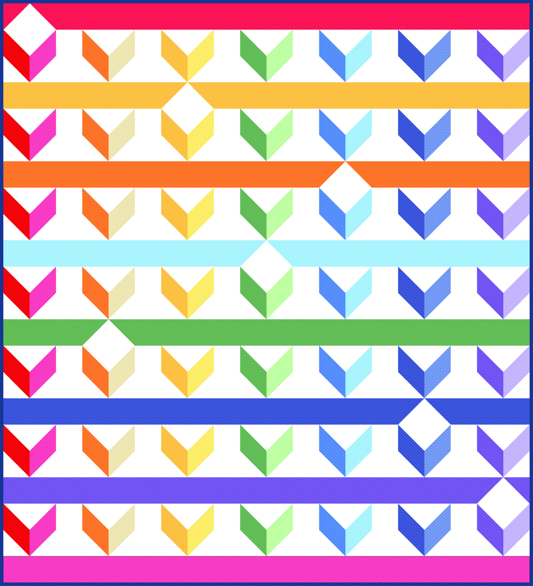 Pieced blocks with dark and light chevrons in rainbow spread using American Jane Pindots