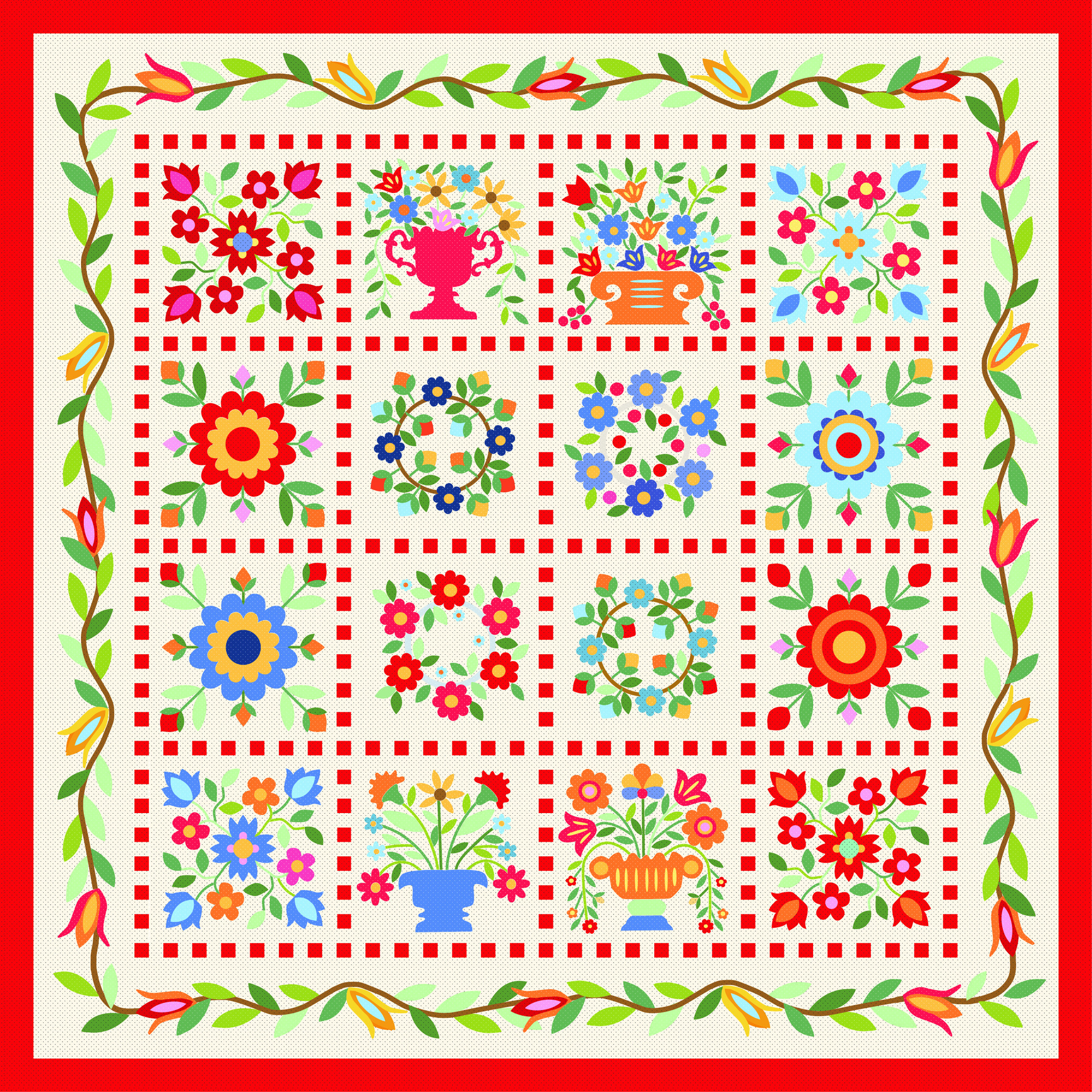 16 appliqué square blocks, red check sashing border and outer vine with flowers and leaves border.